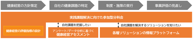 経営層、人事・健保実務担当者向けに、会員の声からみえた5つの健康課題テーマについて、同じ課題意識を持つ企業・団体とともに、解決に向けて議論をします。